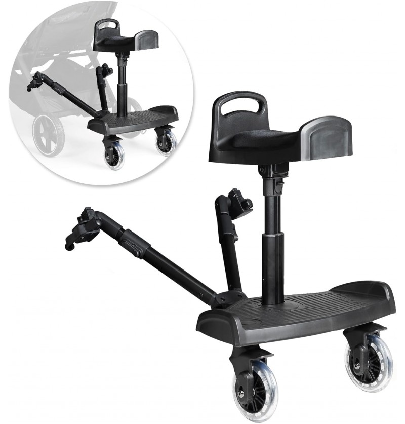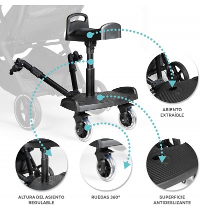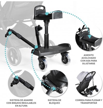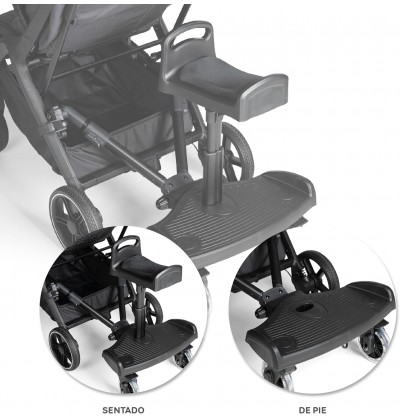 Comfort in ogni passeggiata: il bambino può sedersi o stare in piedi sulla pedana per passeggino Innovaciones MS, rendendo il suo viaggio più piacevole. La pedana si collega al passeggino con uno speciale adattatore incorporato nel prodotto, in grado di adattarsi a tutti i passeggini. Questo tipo di monopattino permette al fratello maggiore di sedersi comodamente a cavalcioni sul monopattino stesso o di andare in piedi.
