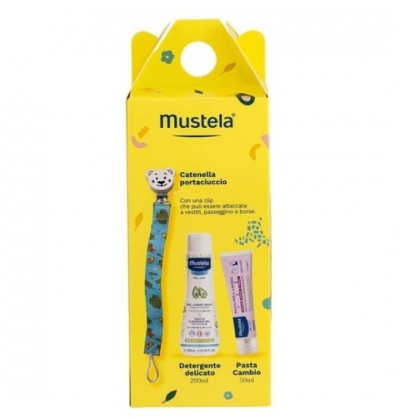 Include il DETERGENTE DELICATO per il bagnetto e la PASTA CAMBIO EFFICACE per la zona pannolino, completato da una pratica catenella porta ciuccio.