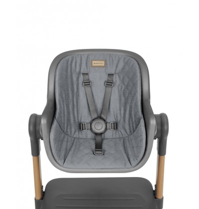 Pronto per la pappa : il seggiolone è dotato di un morbido cuscino di seduta, sistema di cinture a 5 punti, regolazione dell'altezza in 3 posizioni, vassoio mobile con 2 posizioni e un cestino portaoggetti per gli accessori del bambino.