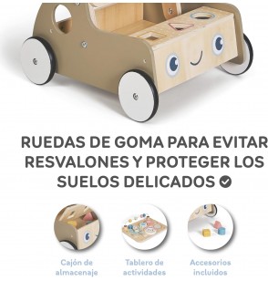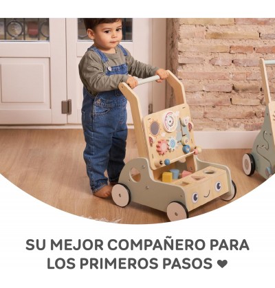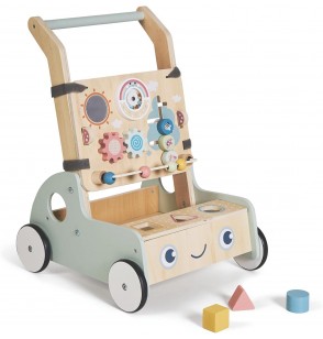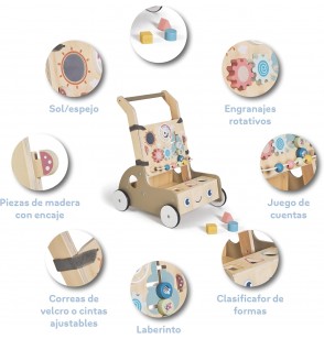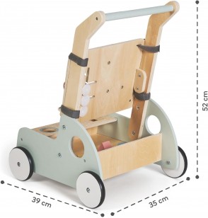 Progettato per camminare ma altrettanto divertente da usare. Viene fornito completo di nove diversi componenti giocattolo, tra cui puzzle di forme, uno xilofono, uno specchio rotante, ingranaggi di legno, un abaco e altri giocattoli sensoriali. Inoltre, ogni girello include i propri blocchi giocattolo.