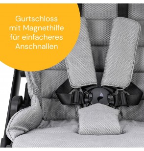 Il sistema di cintura a 5 punti con cintura e spallacci offre al tuo bambino una comoda posizione di seduta. Nella seconda dimensione è possibile regolare diverse posizioni. A seconda delle esigenze del bambino, il poggiapiedi del passeggino può essere regolato su diverse posizioni.