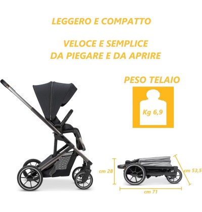 DIMENSIONI: TELAIO APERTO Larghezza: cm 53,5 Altezza: cm 104,5 Lunghezza: cm 97,5 Altezza della maniglia di spinta: Min cm 87 / Max cm 104,5 PESO TELAIO: Peso Telaio: Kg 6,6 Peso telaio con navicella: Kg 11,36 Peso telaio con passeggino: Kg 10,8