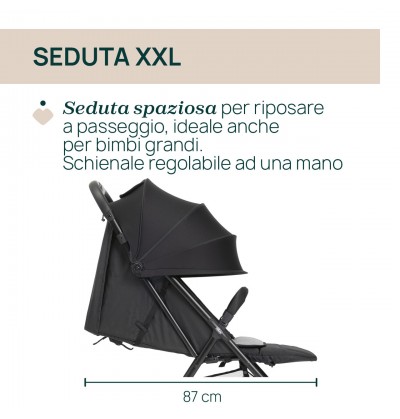 Seduta XXL: lunghezza totale di 87 cm per ospitare comodamente bambini fino a 22 kg.
