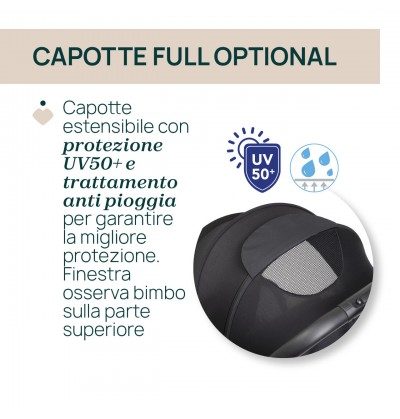 Massima copertura dai raggi solari grazie alla lunga capottina estensibile con protezione UV50+. Include un trattamento idrorepellente e una finestrella in rete sulla parte superiore per mantenere il contatto visivo.