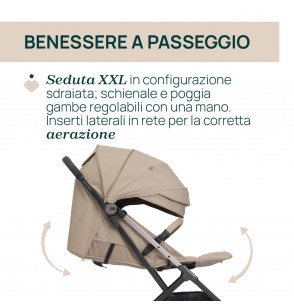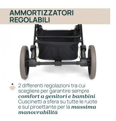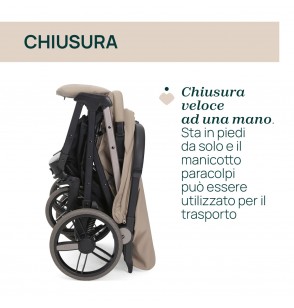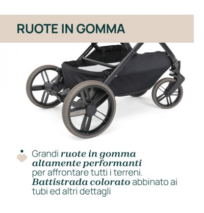 Tessuti soft touch pregiati ed eleganti, arricchiti da dettagli di lusso. Rivestimenti speciali per manicotto, maniglione e poggiagambe. Tubi verniciati in coordinato con i loghi Chicco e gli pneumatici in gomma.
