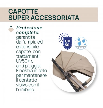 Capottina extra large super accessoriata: è estensibile e dotata di protezione UV50+ e trattamento idrorepellente.