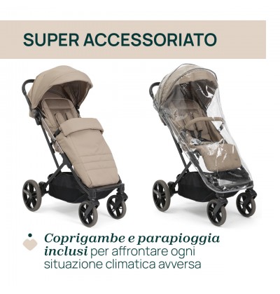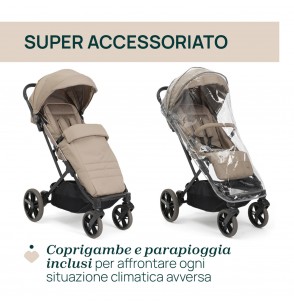 Il passeggino Dolomiti è dotato di kit comfort, coprigambe e parapioggia per coccolare il bambino in ogni situazione.