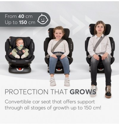 Sedile adattabile: si posiziona nel senso contrario a quello di marcia da 40 fino a 105 cm e rivolto in avanti da 76 fino a 150 cm, con posizioni di reclinazione multiple in entrambe le modalità per garantire comfort in ogni fase di crescita.