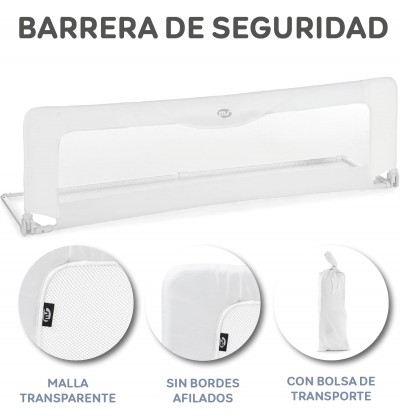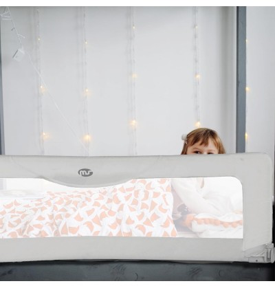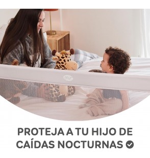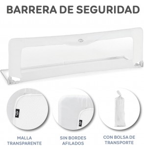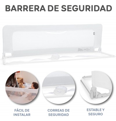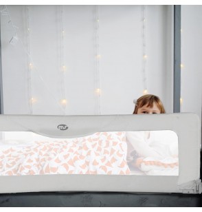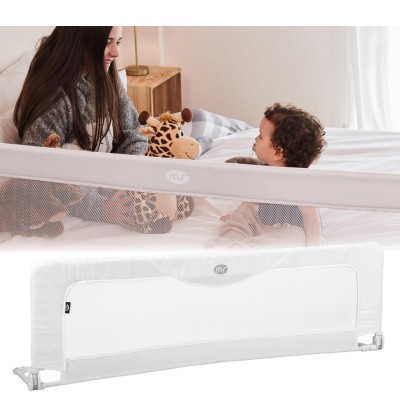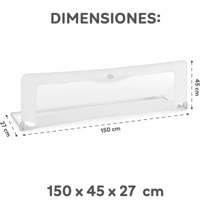 Dispositivo di bloccaggio di sicurezza comodo in posizione verticale e pieghevole. Include strisce di sicurezza che consentono di regolare la barriera per adattarsi a materassi larghi fino a 150 cm. Omologazione secondo la normativa europea di riferimento.